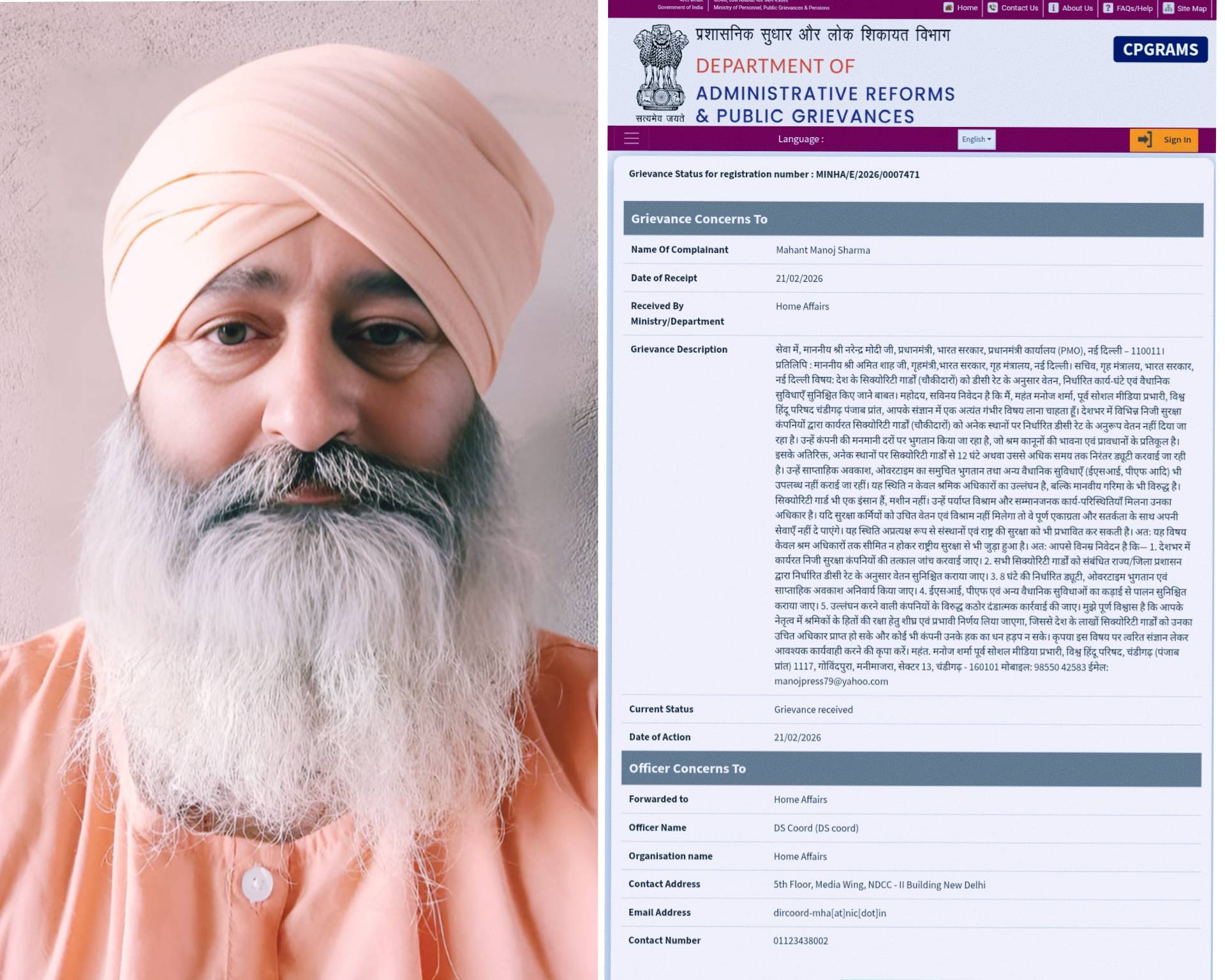 चंडीगढ़। विश्व हिंदू परिषद चंडीगढ़ (पंजाब प्रांत) के पूर्व सोशल मीडिया प्रभारी महंत मनोज शर्मा ने देशभर में कार्यरत सिक्योरिटी गार्डों (चौकीदारों) के हितों की रक्षा को लेकर प्रधानमंत्री श्री नरेंद्र मोदी और गृहमंत्री श्री अमित शाह को पत्र लिखकर…