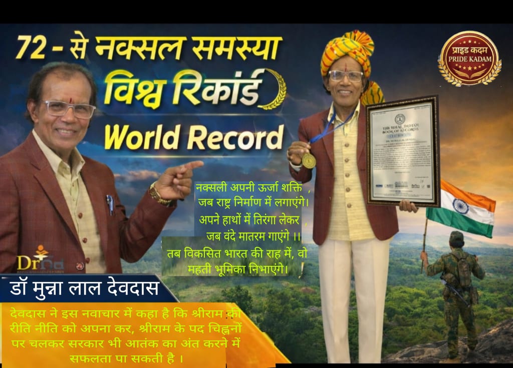 72 – 72 से नक्सल समस्या पर केन्द्रित डाॅ मुन्नालाल देवदास के अद्वितीय नवाचार को मिला वर्ल्ड रिकॉर्ड नक्सली अपनी ऊर्जा शक्ति , जब राष्ट्र निर्माण में लगाएंगे। अपने हाथों में तिरंगा लेकर , जब वंदे मातरम गाएंगे ।। तब विकसित भारत की राह में, वो महती भूमिका निभाएंगे।