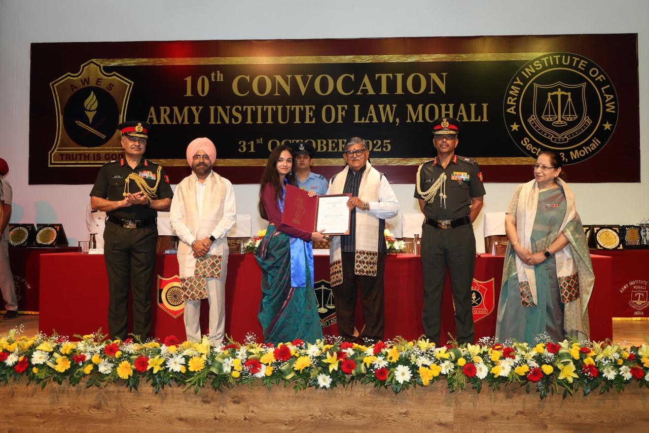 मनोज शर्मा,चंडीगढ़ – आर्मी इंस्टीट्यूट ऑफ लॉ (एआईएल),मोहाली का 10वां दीक्षांत समारोह 31 अक्टूबर 2025 को आयोजित किया गया, जिसमें बी.ए., एल.एल.बी. (ऑनर्स) बैच 2018-23 और 2019-24 के स्नातकों को उपाधियाँ प्रदान की गईं। पंजाब के माननीय राज्यपाल गुलाब चंद…