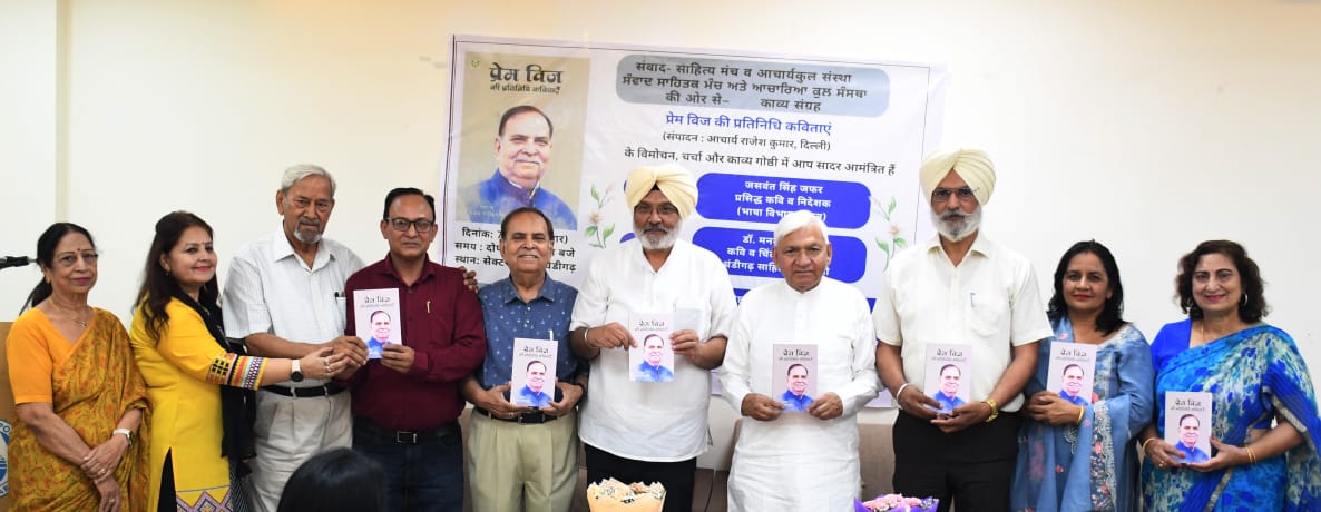 मनोज शर्मा,चंडीगढ़। काव्य संग्रह “प्रेम विज की प्रतिनिधि कविताएं” का विमोचन सैक्टर 43 ए में हुआ। इसका संपादन सुप्रसिद्ध साहित्यकार आचार्य राजेश कुमार ने किया है। कार्यक्रम का आयोजन संवाद साहित्य मंच और आचार्य कुल संस्था,चंडीगढ़ की ओर से किया गया। इस कार्यक्रम के मुख्य अतिथि साहित्यकार जसवंत सिंह जफ़र,निदेशक भाषा विभाग पंजाब और अध्यक्षता वरिष्ठ साहित्यकार व चिंतक और चंडीगढ़ साहित्य अकादमी के अध्यक्ष डॉ. मनमोहन सिंह ने की। इस अवसर पर आचार्य कुल के अध्यक्ष के. के. शारदा,विद्या धाम यू. एस. ए की अध्यक्षा डॉ. सरिता मेहता और पार्षद प्रेमलता बतौर विशेष अतिथि उपस्थिति रहे। कार्यक्रम का संचालन शायरा डॉ. संगीता शर्मा कुंद्रा ‘गीत’ ने किया और पुस्तक पर प्रपत्र कविवर डॉ. विनोद कुमार शर्मा ने प्रस्तुत किया। कार्यक्रम का शुभारंभ पल्लवी रामपाल द्वारा प्रस्तुत सरस्वती वंदना से हुआ तत्पश्चात पुस्तक का विमोचन हुआ।