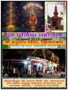 मनोज शर्मा,चंडीगढ़। श्री सिद्ध पीठ श्री दक्षिणमुखी हनुमान मंदिर,शांतिबन खिज्राबाद में गुरुपूर्णिमा महोत्सव इस वर्ष 10 जुलाई 2025 को बड़ी धूमधाम और धार्मिक श्रद्धा के साथ मनाया जाएगा। मंदिर के पीठाधीश्वर एवं संस्थापक, प्रधान , महंत कमल गिरी जी ने बताया कि इस पावन अवसर पर आने वाले सभी भक्तों के लिए विशाल भंडारे का आयोजन किया जाएगा।