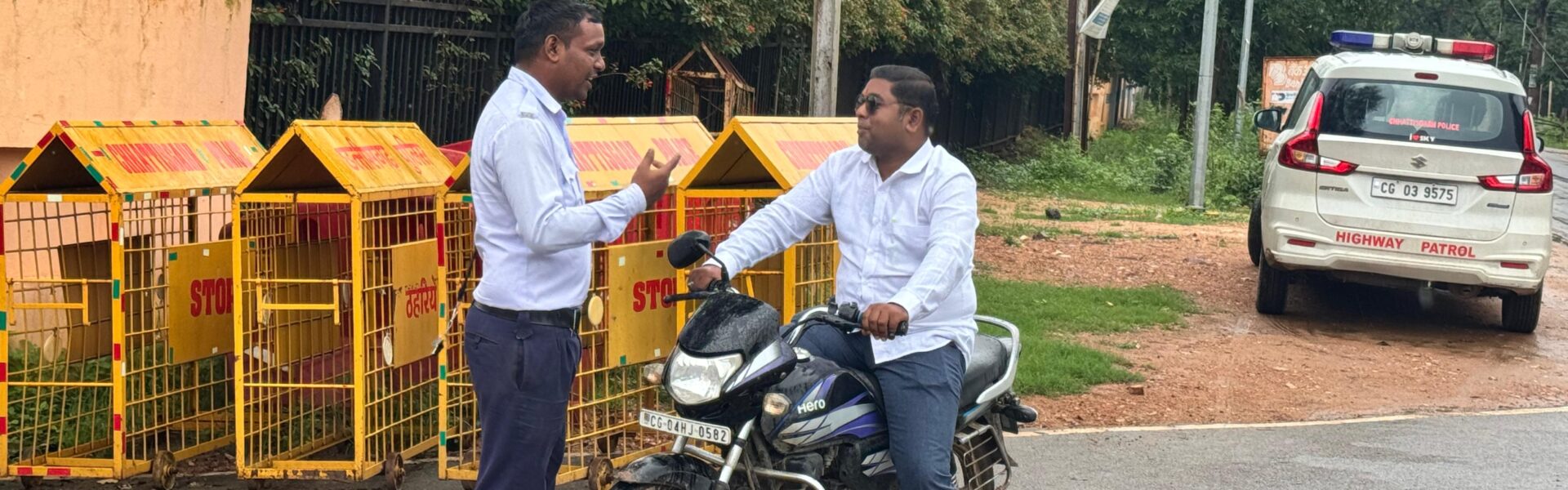 गरियाबंद _ में आज तेज बारिश के बीच कलेक्टोरेट परिसर के मुख्य गेट पर एक अलग ही नज़ारा देखने को मिला ट्रैफिक पुलिस के जवान भीगते हुए वहां डटे रहे और आने-जाने वाले अधिकारियों-कर्मचारियों को एक-एक कर रोककर हेलमेट और सीट बेल्ट की अनिवार्यता को लेकर समझाइश देते नज़र आए।