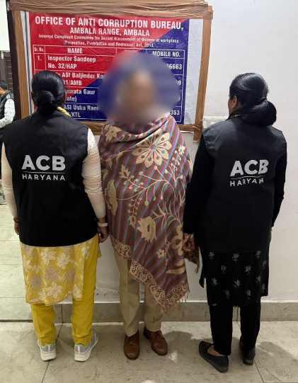 चंडीगढ, 28 नवंबर।       राज्य सतर्कता एवं भ्रष्टाचार निरोधक ब्यूरो, अम्बाला द्वारा शिकायतकर्ता की शिकायत पर कार्यवाही करते हुये आज दिनांक 28.11.2025 को आरोपीया पुलिस उप निरीक्षक सत्यवन्ती, न. 1051/कुरूक्षेत्र, अतिरिक्त थाना प्रबन्धक, महिला पुलिस थाना, कुरूक्षेत्र को शिकायतकर्ता से 85,000/- (पचासी हजार) रूपये नकद रिश्वत लेते हुये महिला थाना, कुरूक्षेत्र से रंगे हाथो गिरफ्तार किया गया तथा इस सम्बन्ध में आरोपीया पुलिस उप निरीक्षक सत्यवन्ती उपरोक्त के विरूद्व अभियोग संख्या 33 दिनांक 28.11.2025 धारा 7 पी.सी. एक्ट 1988 व 308(2) बी.एन.एस. के तहत थाना राज्य सतर्कता एवं भ्रष्टाचार निरोधक ब्यूरो, अम्बाला दर्ज किया गया।