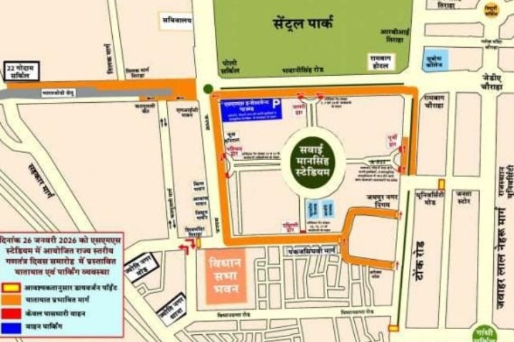 जयपुर,(सुरेन्द्र कुमार सोनी) । सवाई मानसिंह स्टेडियम में दिनांक 26 जनवरी 2026 को राज्य स्तरीय गणतंत्र दिवस समारोह का आयोजन किया जावेगा। आयोजित समारोह के दौरान यातायात के सुगम व सुव्यवस्थित संचालन हेतु यातायात व पार्किंग व्यवस्था निम्न प्रकार रहेगी।