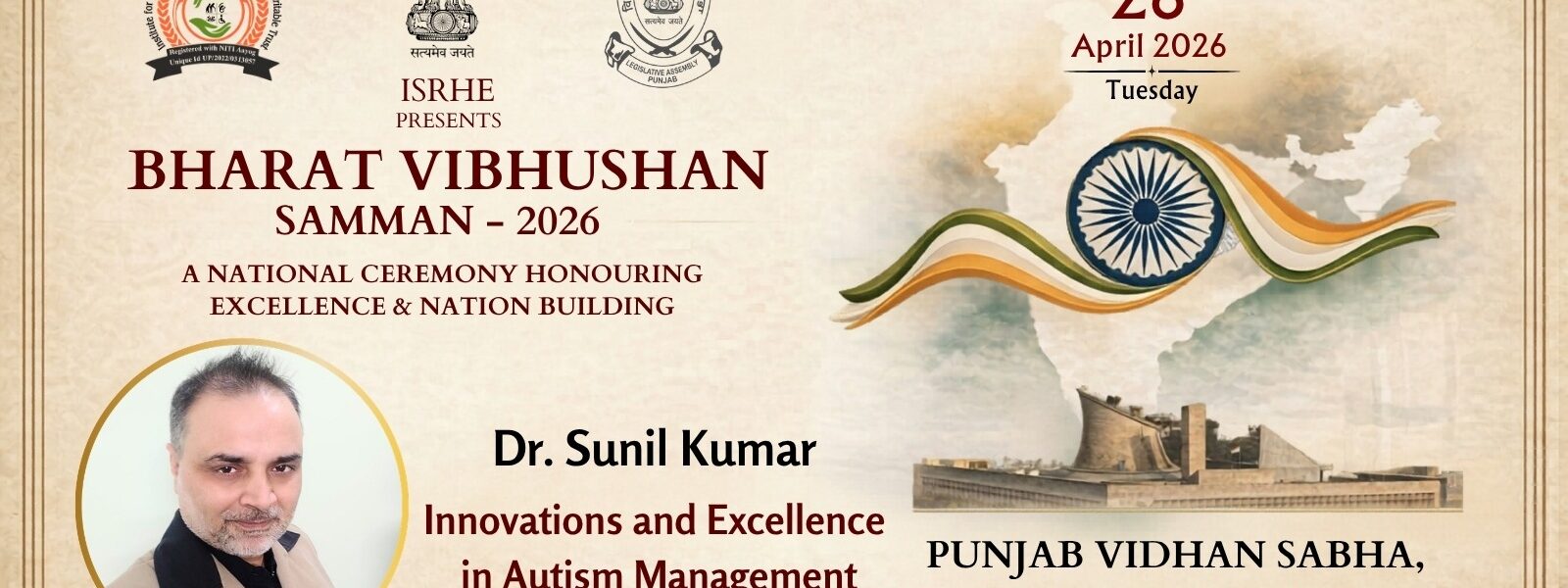 यह राष्ट्रीय स्तर का सम्मान समारोह 28 अप्रैल 2026 (मंगलवार) को पंजाब विधानसभा, चंडीगढ़ स्थित विदान भवन में आयोजित किया जाएगा। इस कार्यक्रम का आयोजन ISRHЕ (Institute for Social Reform and Higher Education) द्वारा किया जा रहा है, जिसमें देशभर से विभिन्न क्षेत्रों में उत्कृष्ट कार्य करने वाले व्यक्तियों को सम्मानित किया जाएगा।